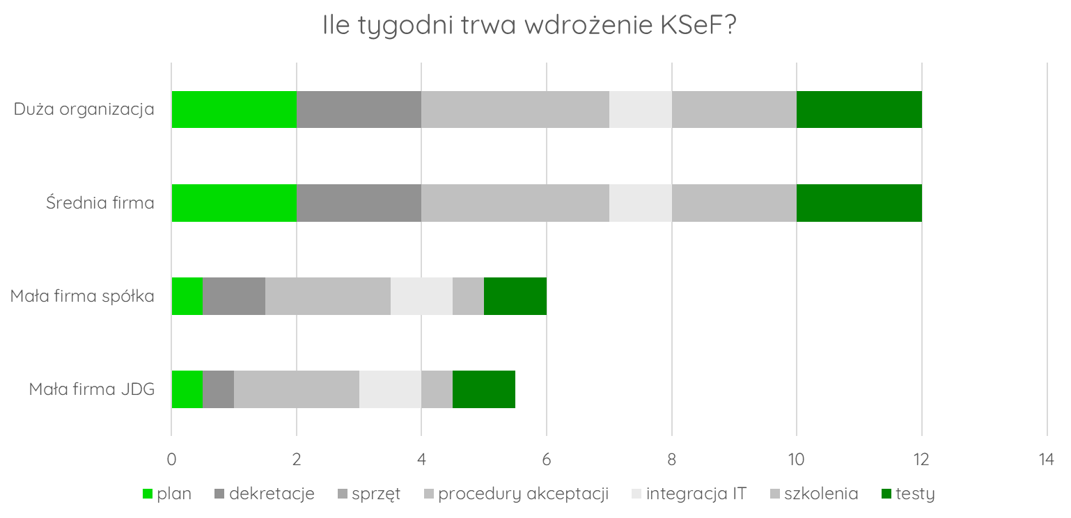 Średni czas wdrożenia zależy od wielkości firmy. Małe firmy (do 10 pracowników) potrzebują około 6 tygodni, średnie firmy (10-50 pracowników) – około 11 tygodni, a duże organizacje (ponad 50 pracowników) – nawet 12 tygodni.